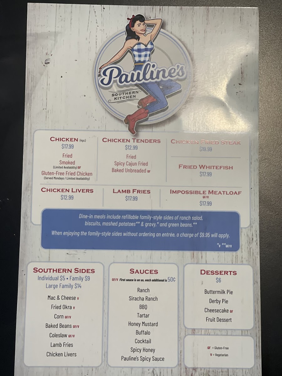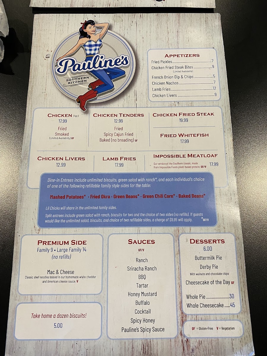 “ After hearing about Pauline’s concept, we were excited to give it a try. (It’s a very similar concept of Babe’s in the DFW area, if you’re familiar with their restaurants.) We really enjoyed our experience. The wait staff was friendly and accommodating. We decided to try both the fried chicken strips and the fried chicken. Little Flip Out had the kids fried chicken strips. As a family style serving, you get biscuits, green beans, salad with the ranch dressing mixed in, mashed potatoes and gravy, and they are unlimited sides. We really enjoyed the biscuits, and thought they had good flavor and texture. Mrs. Flip Out liked the green beans. We all liked the salad, even Little Flip Out. What really stood out to us was the gravy. It was delicious! We thought the chicken was great; our order had perfectly fried chicken and chicken strips. They offer a long list of sauces, and I ordered most of them to try, and each one paired nicely with the chicken. We definitely look forward to going again! ”